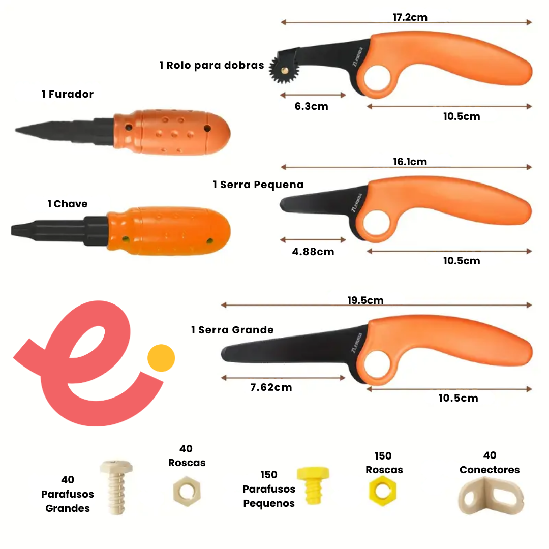 Esse kit foi desenvolvido especialmente para mãos pequenas, garantindo segurança e facilidade no uso. Todas as ferramentas possuem pontas sem corte e design ergonômico, permitindo que as crianças construam de forma independente, divertida e colaborativa.
